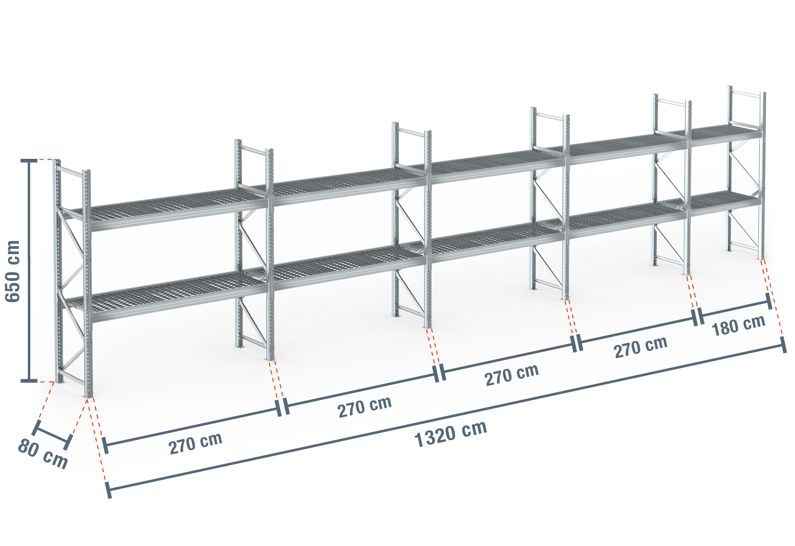 13,2 m rayonnage à palettes PR9000F galvanisé / profondeur 80 cm / hauteur 6,5 m / 2 niveaux / platelage Grillage