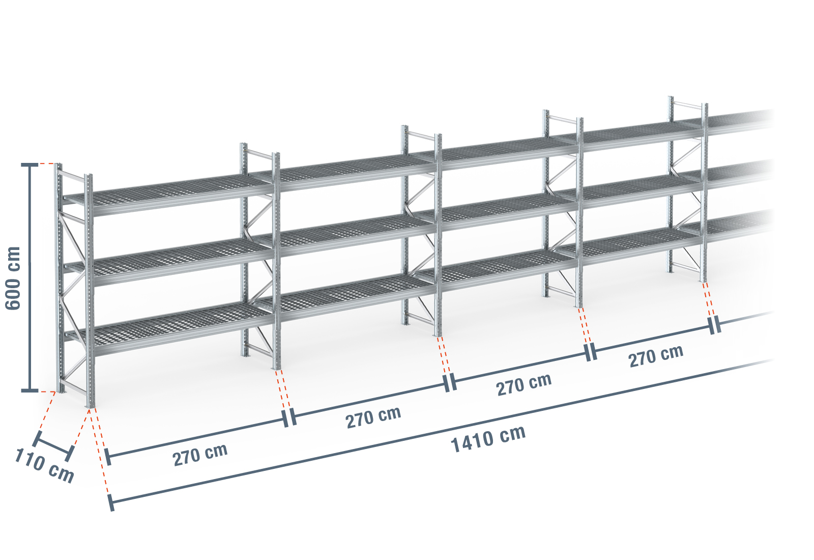 14,1 m rayonnage à palettes PR9000F galvanisé / profondeur 110 cm / hauteur 6 m / 3 niveaux / platelage Grillage