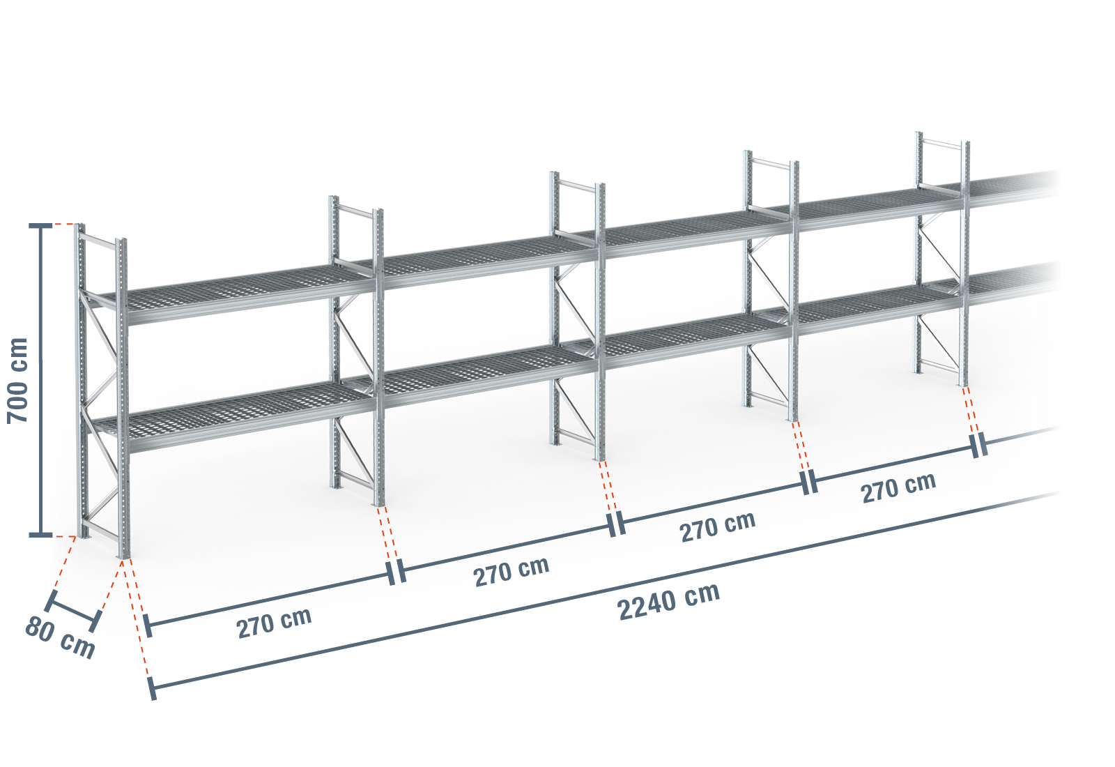 22,4 m rayonnage à palettes PR9000F galvanisé / profondeur 80 cm / hauteur 7 m / 2 niveaux / platelage Grillage