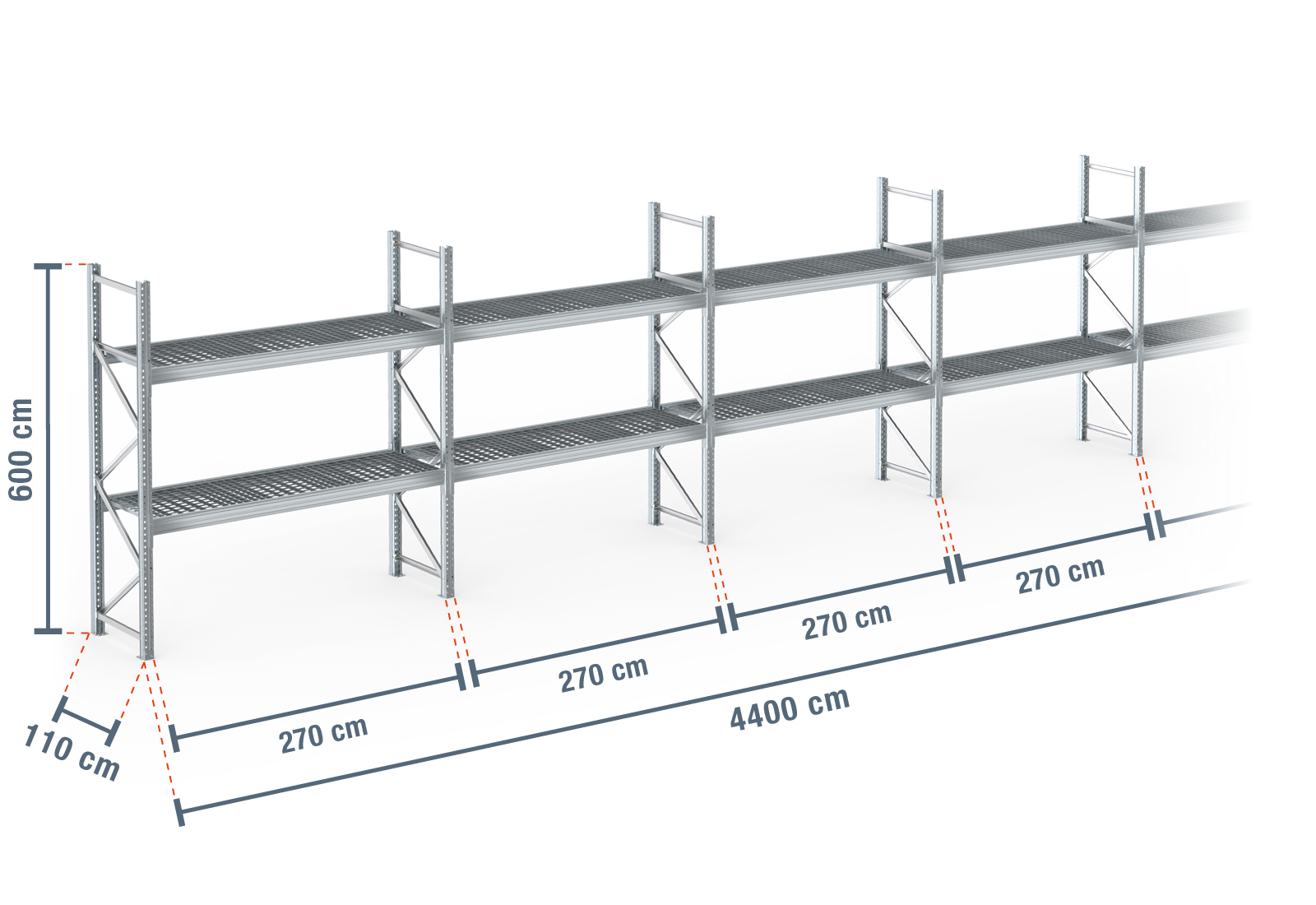 44 m rayonnage à palettes PR9000F galvanisé / profondeur 110 cm / hauteur 6 m / 2 niveaux / platelage Grillage
