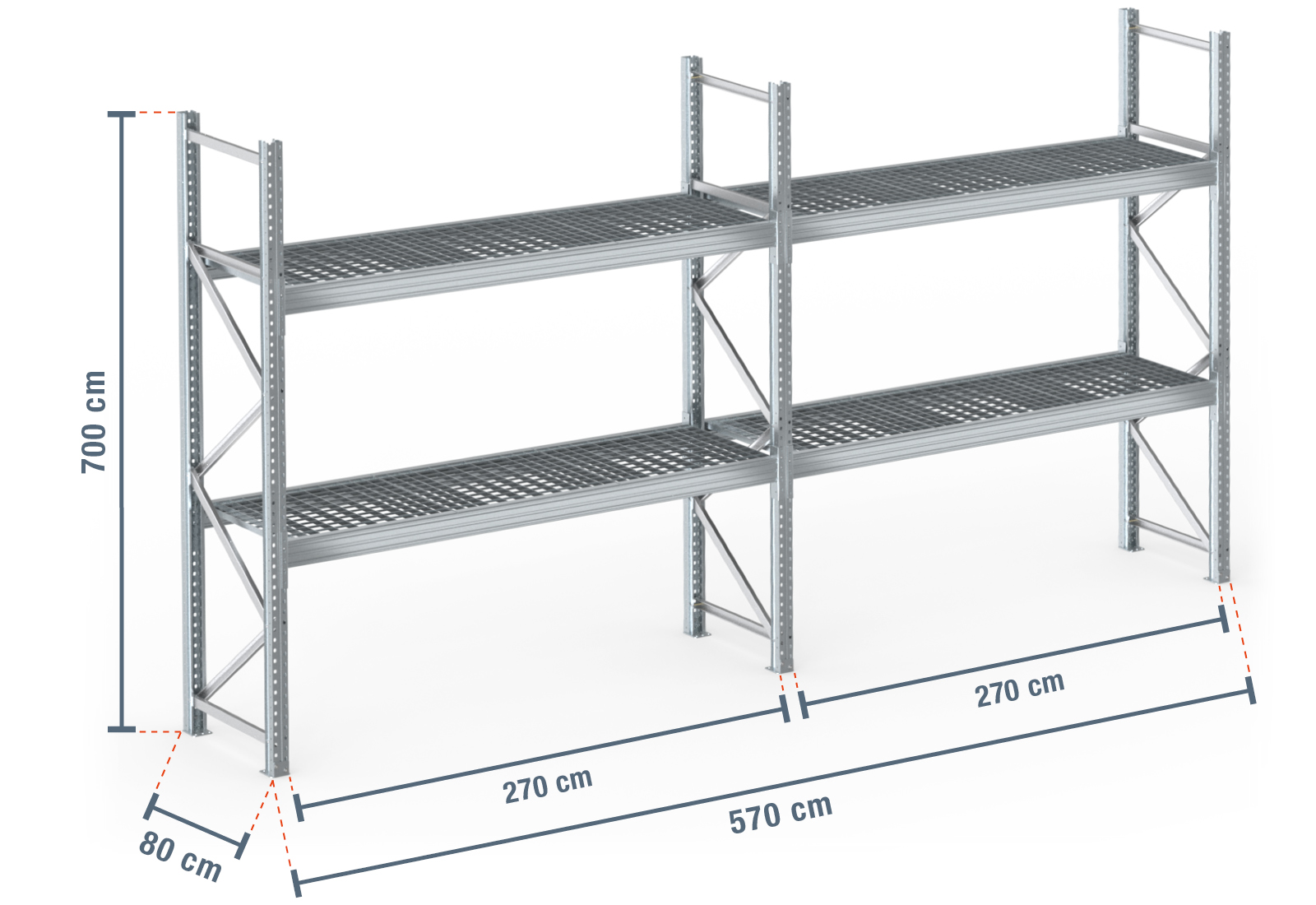 5,7 m rayonnage à palettes PR9000F galvanisé / profondeur 80 cm / hauteur 7 m / 2 niveaux / platelage Grillage