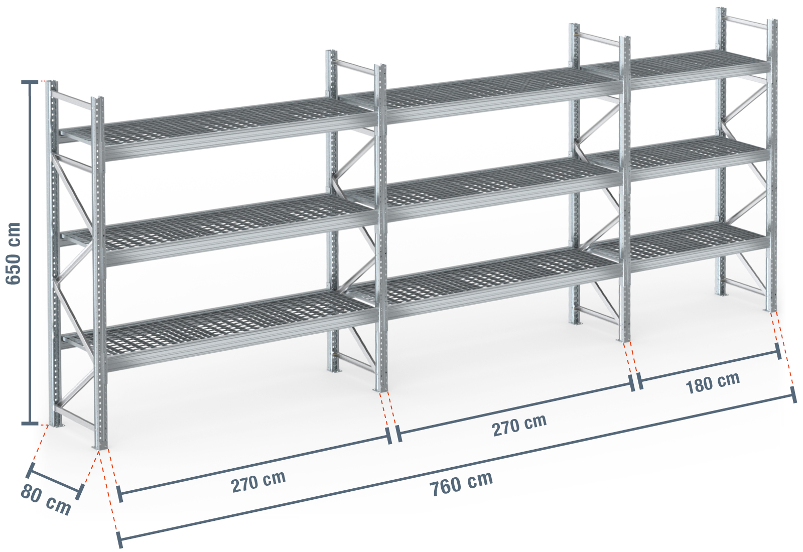 7,6 m rayonnage à palettes PR9000F galvanisé / profondeur 80 cm / hauteur 6,5 m / 3 niveaux / platelage Grillage
