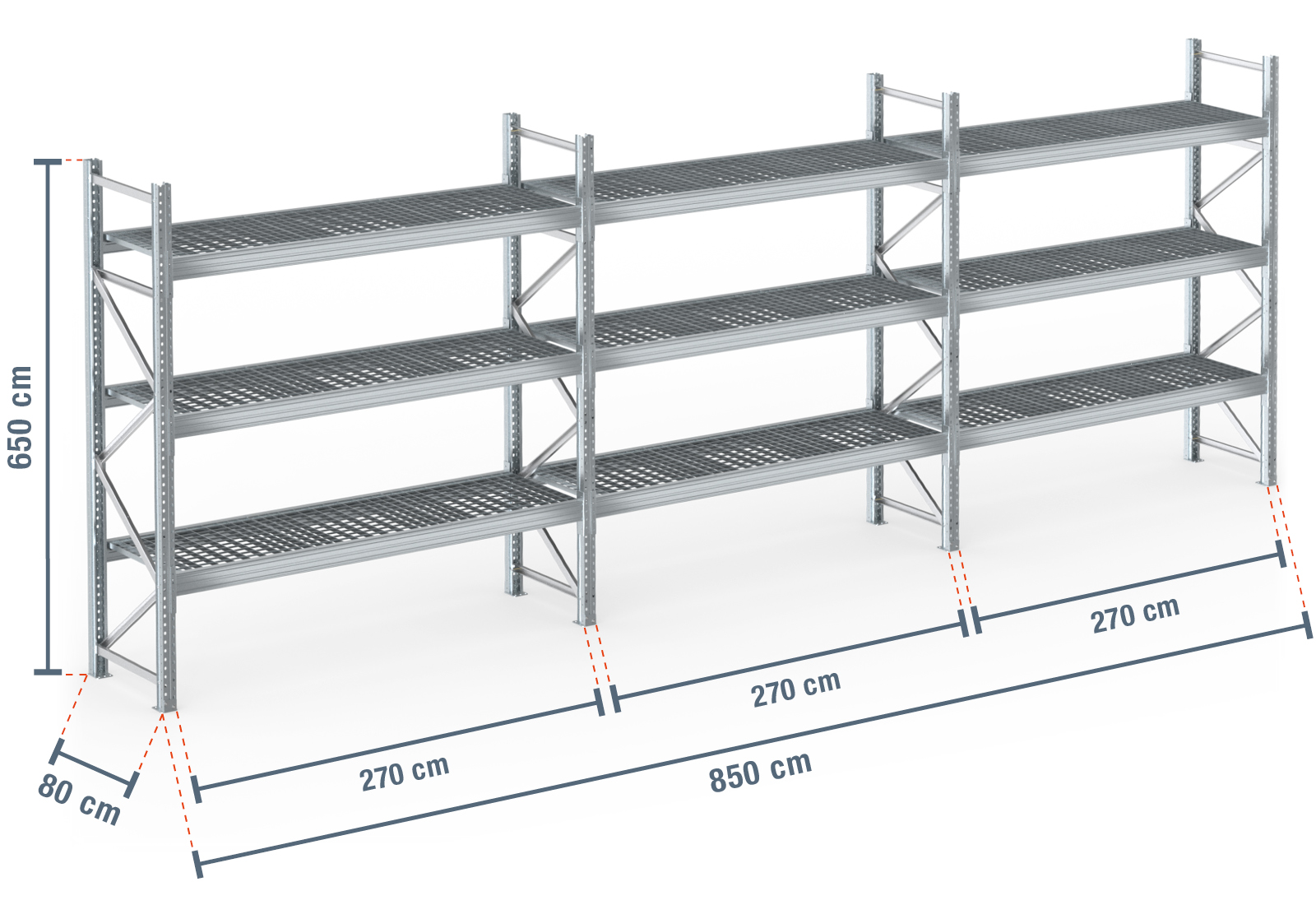 8,5 m rayonnage à palettes PR9000F galvanisé / profondeur 80 cm / hauteur 6,5 m / 3 niveaux / platelage Grillage