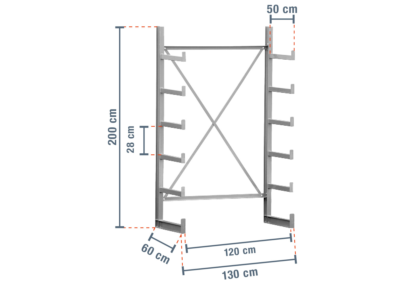 Ce rack cantilever particulièrement robuste de 1,3 m de large et 2 m de haut possède 5 niveaux avec une profondeur de bras de 50 cm. Avec le modèle simple face doté de cantilevers déjà soudés, chaque montant peut supporter une charge maximale de 1.250 kg, chaque bras offrant une capacité de charge maximale de 250 kg.