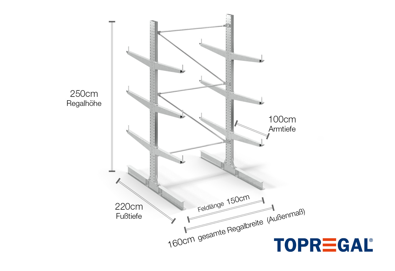 1,6 m rayonnage cantilever KR3000 / Galvanisé à chaud / Bilatéral / 2,5 m hauteur / 100 cm cantilever profondeur / 3 niveaux