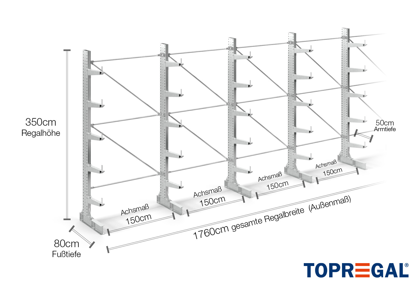 17,6 m rayonnage cantilever KR3000 / Galvanisé à chaud / Unilatéral / hauteur 3,5 m / 50 cm cantilever profondeur / 5 niveaux
