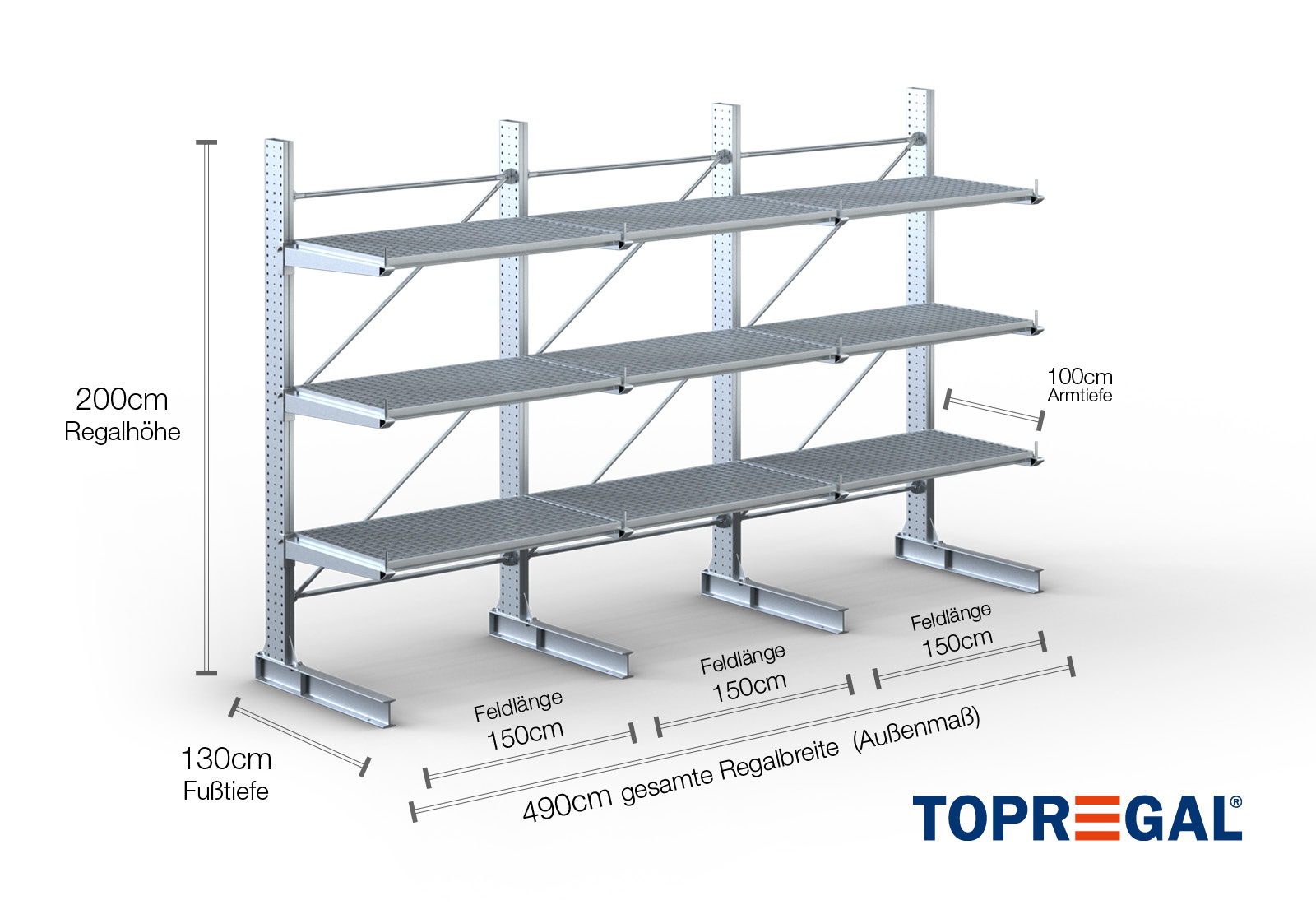 4,9 m rayonnage cantilever KR3000 / Galvanisé à chaud / Unilatéral / hauteur 2 m / 100 cm cantilever profondeur / 3 niveaux / platelage Grillage