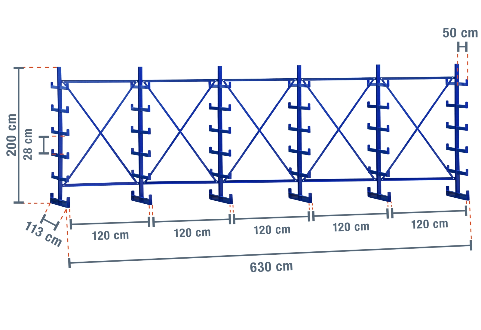 Ce rack cantilever particulièrement robuste de 6,3 m de large et 2 m de haut possède 5 niveaux avec une profondeur de bras de 50 cm. Avec le modèle double face doté de cantilevers déjà soudés, chaque montant peut supporter une charge maximale de 2.500 kg, chaque bras offrant une capacité de charge maximale de 250 kg.