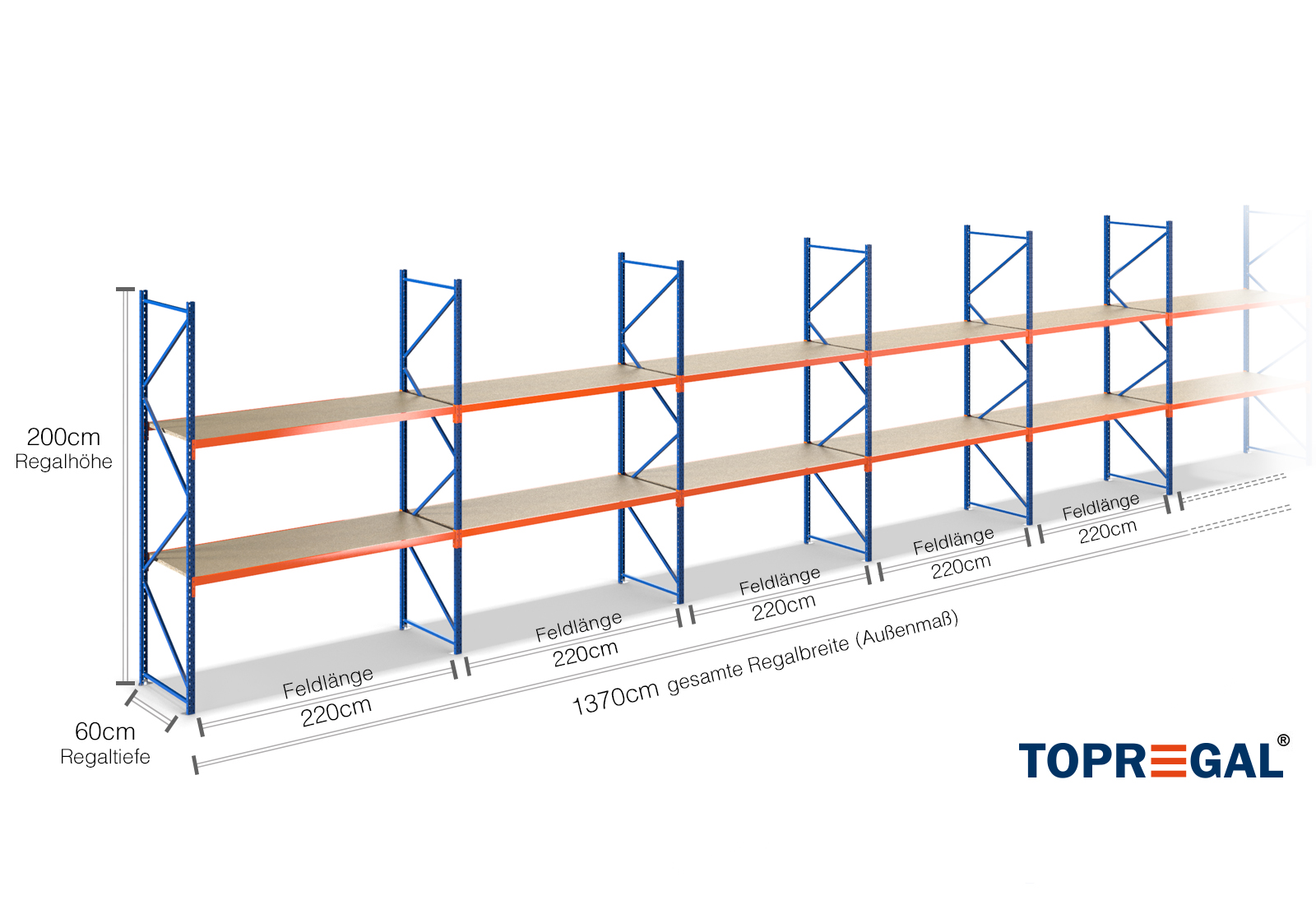 Ce rack de stockage se distingue par sa hauteur de 2 m, sa profondeur de 60 cm et sa largeur de 13,7 m. Les 2 niveaux supportent chacun une charge maximale de 500 kg, la charge maximale entre deux montants (charge d’unité) de 2.000 kg ne devant alors jamais être dépassée. Ces indications se réfèrent toujours à une charge uniforme sur les racks. L’installation s’effectue facilement et rapidement grâce au système d’enfichage. Il existe en outre un vaste choix de composants individuels et d’accessoires destinés aux racks à grande portée de TOPREGAL, tels que les montants de rack, les traverses, les bandes magnétiques et les bacs à bec.