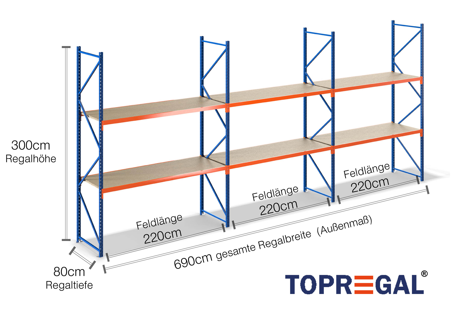 Toutes les données se réfèrent à des charges uniformément réparties. En cas de chargement, la charge par plateau et la charge par travée ne doivent pas être dépassées. En principe, les directives actuelles sur la sécurité et la santé au travail s'appliquent lors de l'utilisation (Règle DGUV allemande 208-061). TOPREGAL décline toute responsabilité en cas d'accidents/dommages dus à une utilisation non conforme. Notre équipe de conseillers spécialisés répondra à vos questions à ce sujet. Les dimensions indiquées sont approximatives et peuvent varier de quelques centimètres. Contactez-nous si vous avez besoin des dimensions exactes du produit que vous souhaitez acheter.