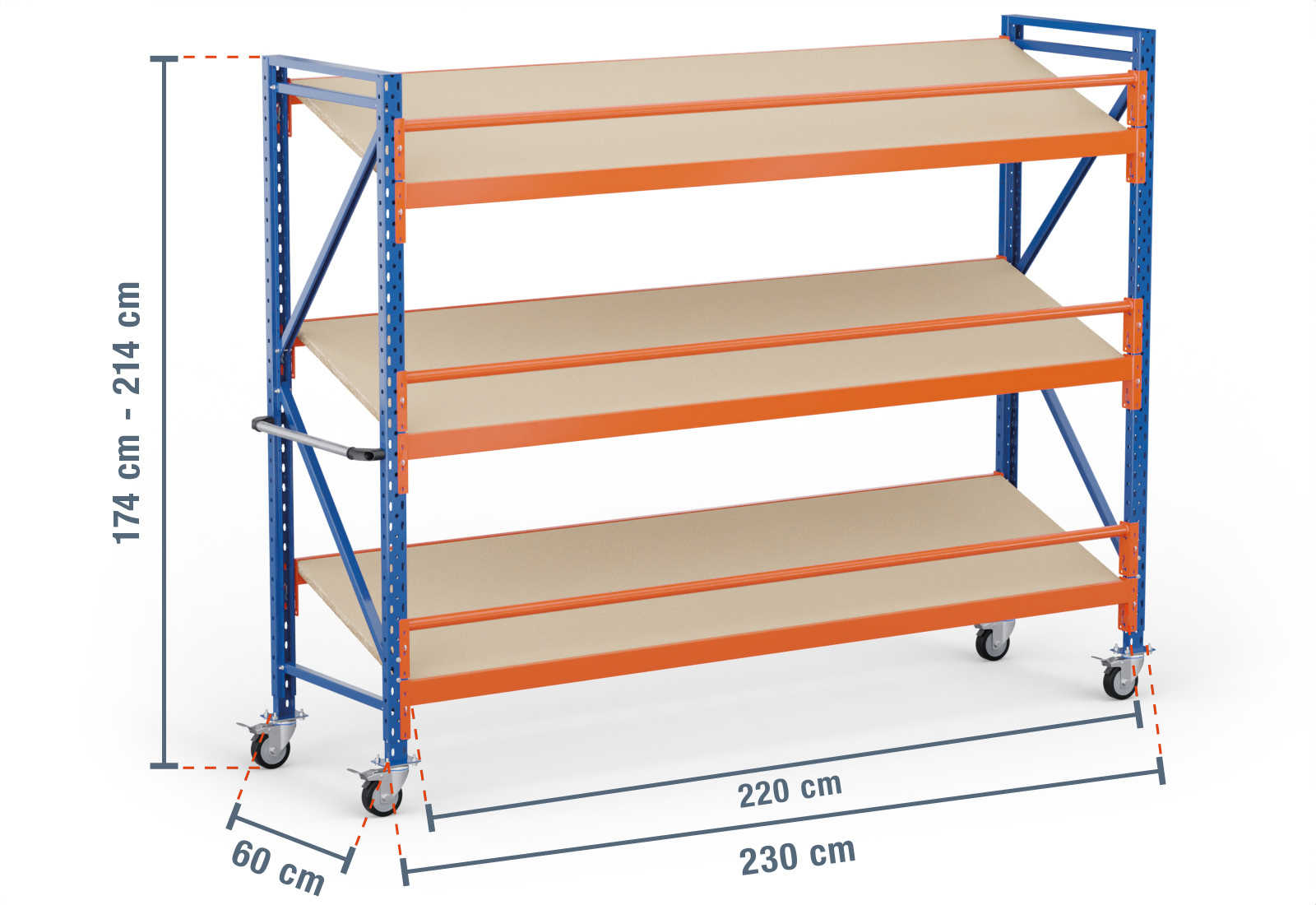 La cote extérieure de ce rack à tablettes inclinées mobile s’élève à 2,3 m, avec une surface de pose utile, appelée « cote intérieure », plus courte de 10 cm. La capacité de charge maximale d’une tablette est de 300 kg et la charge d’unité (charge maximale entre deux montants de rack avec une répartition homogène du poids) s’élève à 500 kg.