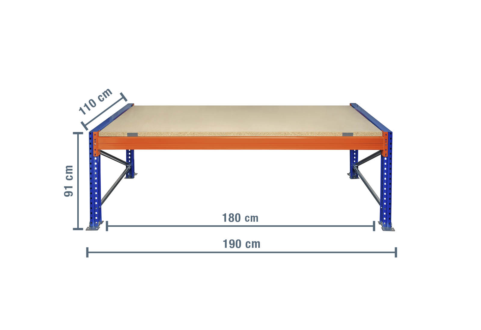 Cette table d’emballage de dimensions 1,9 m x 110 cm x 0,91 m comporte 1 platelages en bois pour rack à palettes fabriqués à partir d’un aggloméré brut. Cela permet de stocker et de traiter des marchandises sèches. Le platelage en bois peut être posé en toute sécurité sur les traverses peintes en orange avec les tôles en Z fournies. Cette construction empêche le platelage de glisser ou de tomber et contribue à la sécurité au travail. Les différents niveaux peuvent être accrochés individuellement sur une trame de 50 mm. La surface de pose utile de cette table d’emballage est de 180 cm.