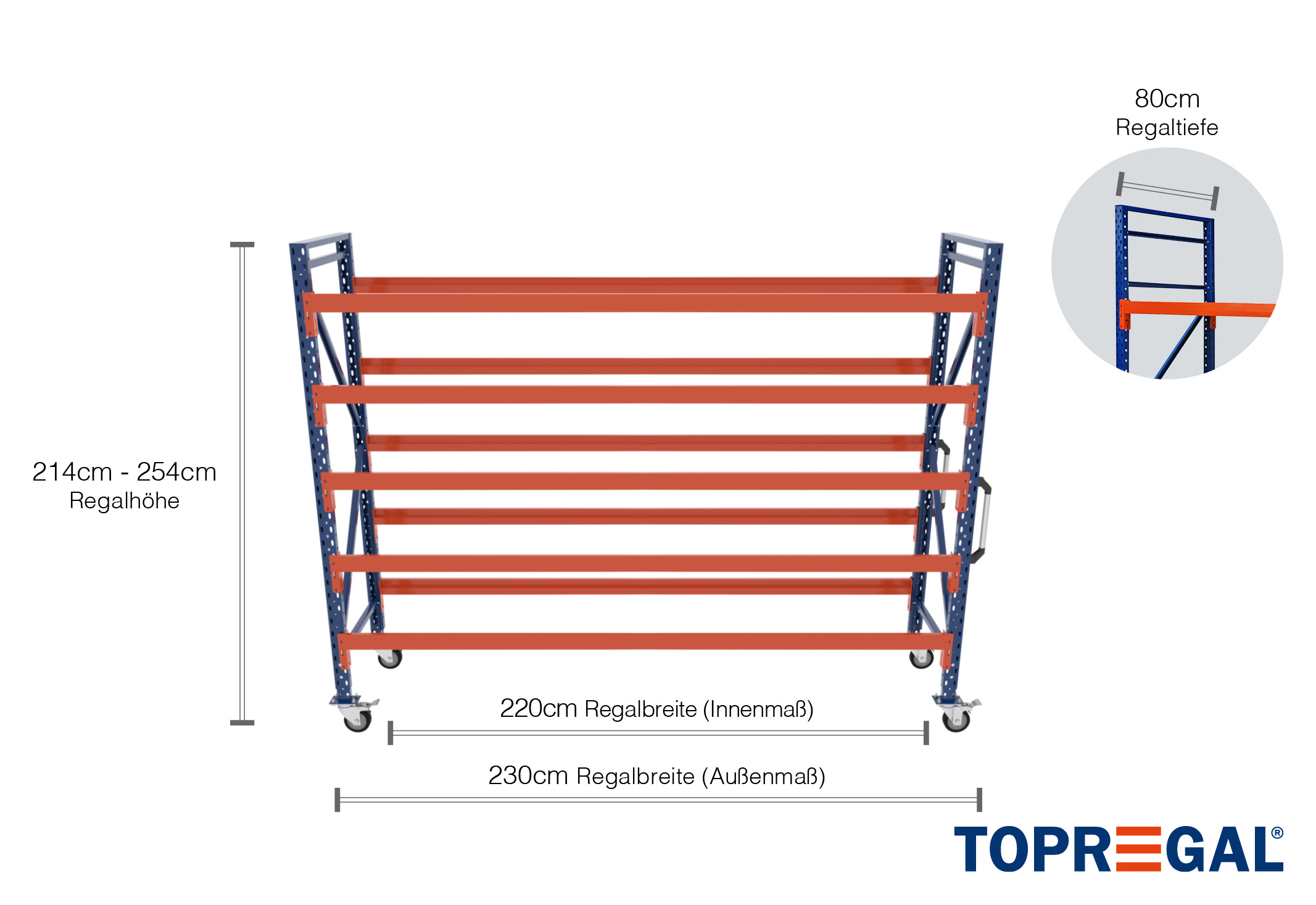 De buitenmaat is 2,3 m. Het bruikbare bodemoppervlak (binnenmaat) is 10 cm smaller en komt overeen met de gekozen traverselengte. Op de 5 niveaus kunt u uw goederen eenvoudig opslaan. Deze mogen een maximale last van 500 kg per veld en 500 kg per vak niet overschrijden. Deze informatie is altijd gebaseerd op gelijkmatig verdeelde lasten.