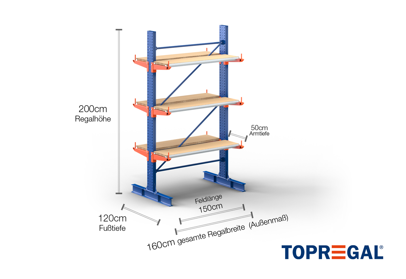 Deze draagarmstelling als dubbelzijdige uitvoering met een breedte van 1,6 m is 2 m hoog, heeft een totale diepte van 120 cm en beschikt over 3 draagarmniveaus, met een armdiepte van 50 cm. De belasting per arm bedraagt hierbij maximaal 500 kg. De draagarmen kunnen individueel in een rooster van 50 mm worden gehaakt en worden geborgd door middel van veiligheidsbouten en -pinnen. Ook de voetdelen kunnen (afhankelijk van de goederen) als opslagniveau worden gebruikt. Om de lading tegen onbedoeld verschuiven te beschermen, kan aan het einde van elke draagarm een afrolbeveiliging gestoken worden. Dit is standaard bij de leveringsomvang inbegrepen.
