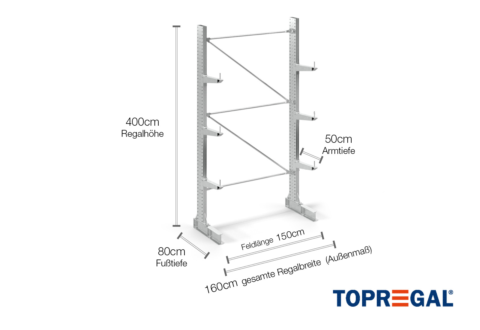 Deze draagarmstelling als eenzijdige uitvoering met een breedte van 1,6 m is 4 m hoog, heeft een totale diepte van 80 cm en beschikt over 3 draagarmniveaus, met een armdiepte van 50 cm. De belasting per arm bedraagt hierbij maximaal 500 kg. De draagarmen kunnen individueel in een rooster van 50 mm worden gehaakt en worden geborgd door middel van veiligheidsbouten en -pinnen. Ook de voetdelen kunnen (afhankelijk van de goederen) als opslagniveau worden gebruikt. Om de lading tegen onbedoeld verschuiven te beschermen, kan aan het einde van elke draagarm een afrolbeveiliging gestoken worden. Dit is standaard bij de leveringsomvang inbegrepen.