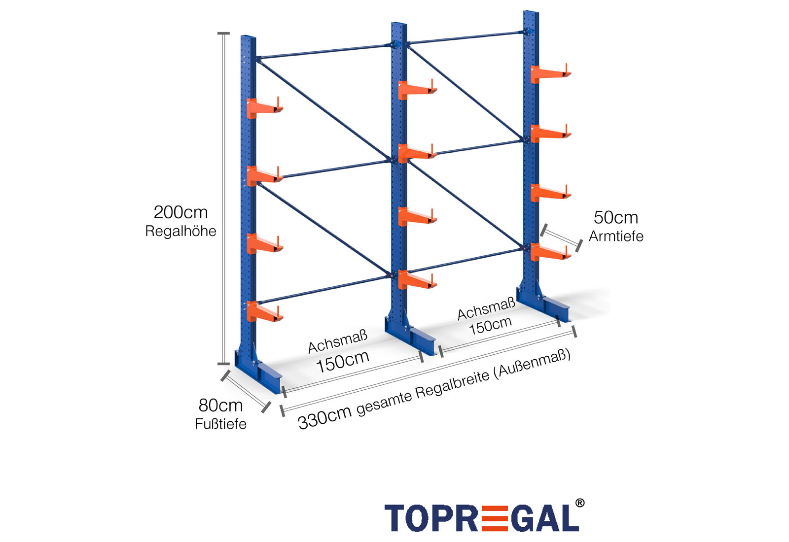 Deze draagarmstelling als eenzijdige uitvoering met een breedte van 3,3 m is 2 m hoog, heeft een totale diepte van 80 cm en beschikt over 4 draagarmniveaus, met een armdiepte van 50 cm. De belasting per arm bedraagt hierbij maximaal 500 kg. De draagarmen kunnen individueel in een rooster van 50 mm worden gehaakt en worden geborgd door middel van veiligheidsbouten en -pinnen. Ook de voetdelen kunnen (afhankelijk van de goederen) als opslagniveau worden gebruikt. Om de lading tegen onbedoeld verschuiven te beschermen, kan aan het einde van elke draagarm een afrolbeveiliging gestoken worden. Dit is standaard bij de leveringsomvang inbegrepen.