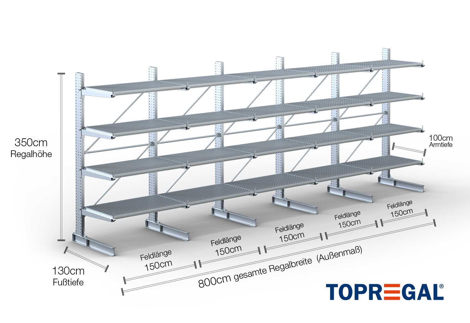 Deze draagarmstelling als eenzijdige uitvoering met een breedte van 8 m is 3,5 m hoog, heeft een totale diepte van 130 cm en beschikt over 4 draagarmniveaus, met een armdiepte van 100 cm. De belasting per arm bedraagt hierbij maximaal 500 kg. De draagarmen kunnen individueel in een rooster van 50 mm worden gehaakt en worden geborgd door middel van veiligheidsbouten en -pinnen. Ook de voetdelen kunnen (afhankelijk van de goederen) als opslagniveau worden gebruikt. Om de lading tegen onbedoeld verschuiven te beschermen, kan aan het einde van elke draagarm een afrolbeveiliging gestoken worden. Dit is standaard bij de leveringsomvang inbegrepen.