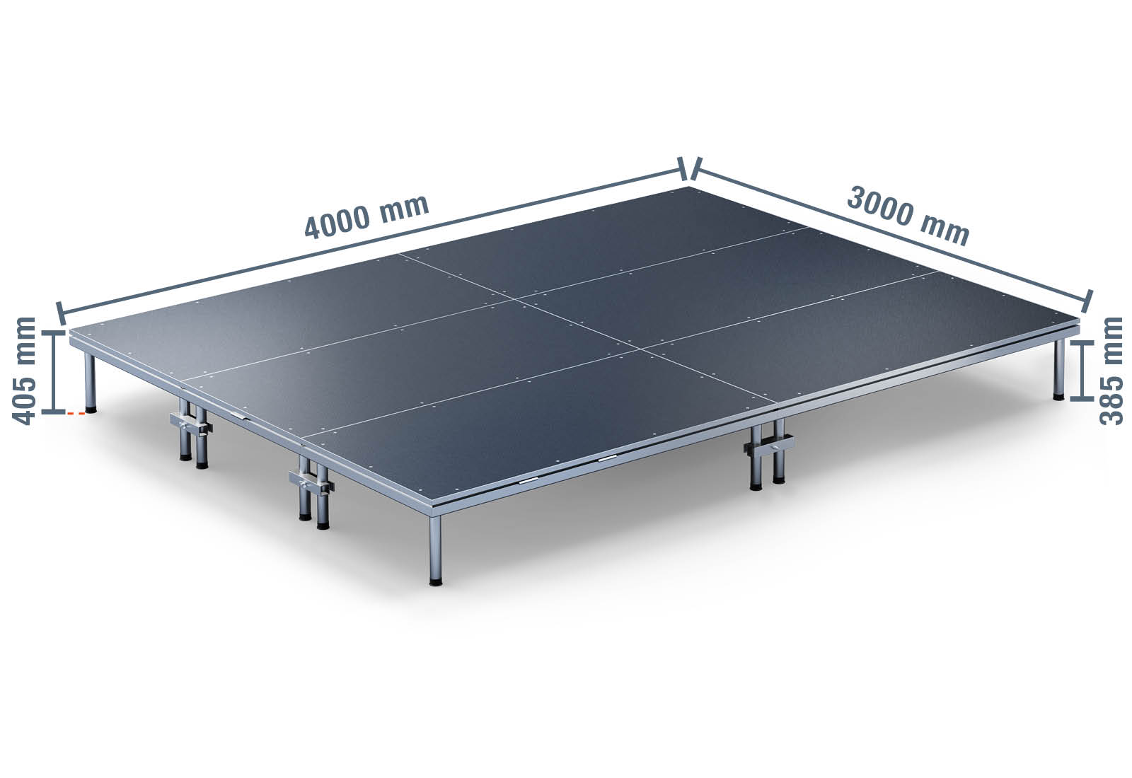 - Modulair bouwsysteem met 2.000 mm x 1.000 mm grote podiumplaten