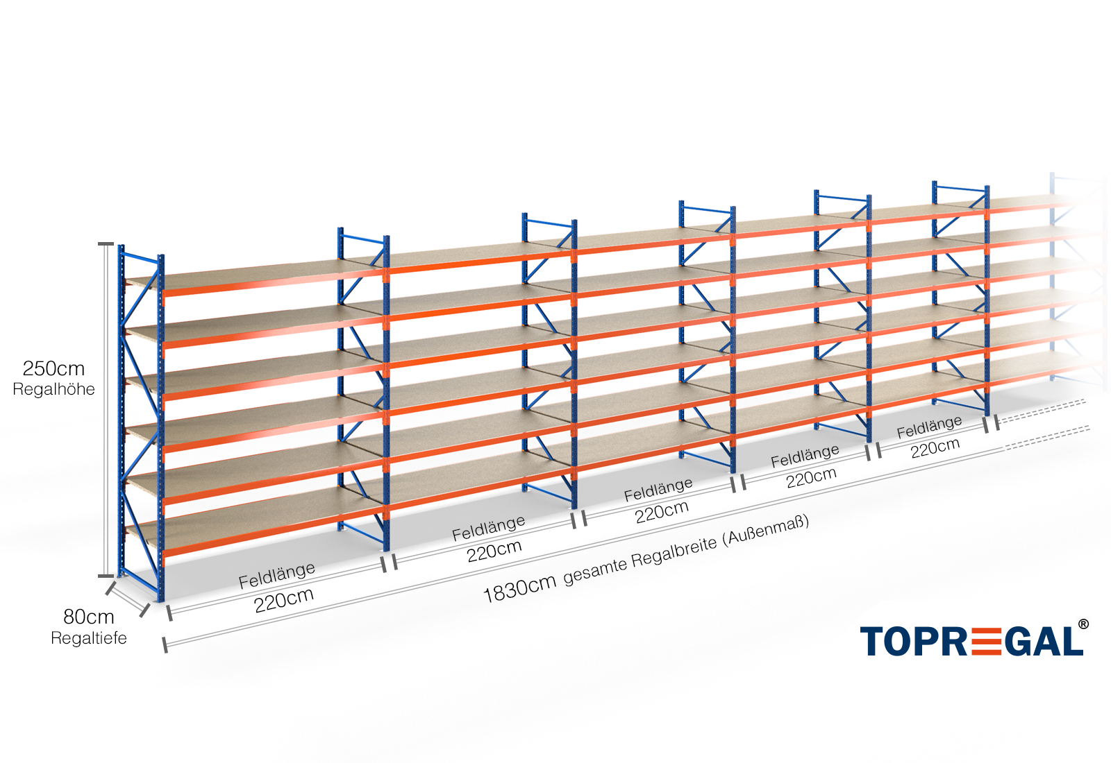 18,3 m magazijnstelling LR2000 / 80 cm diep / 2,5 m hoog / 6 niveaus / bodem hout