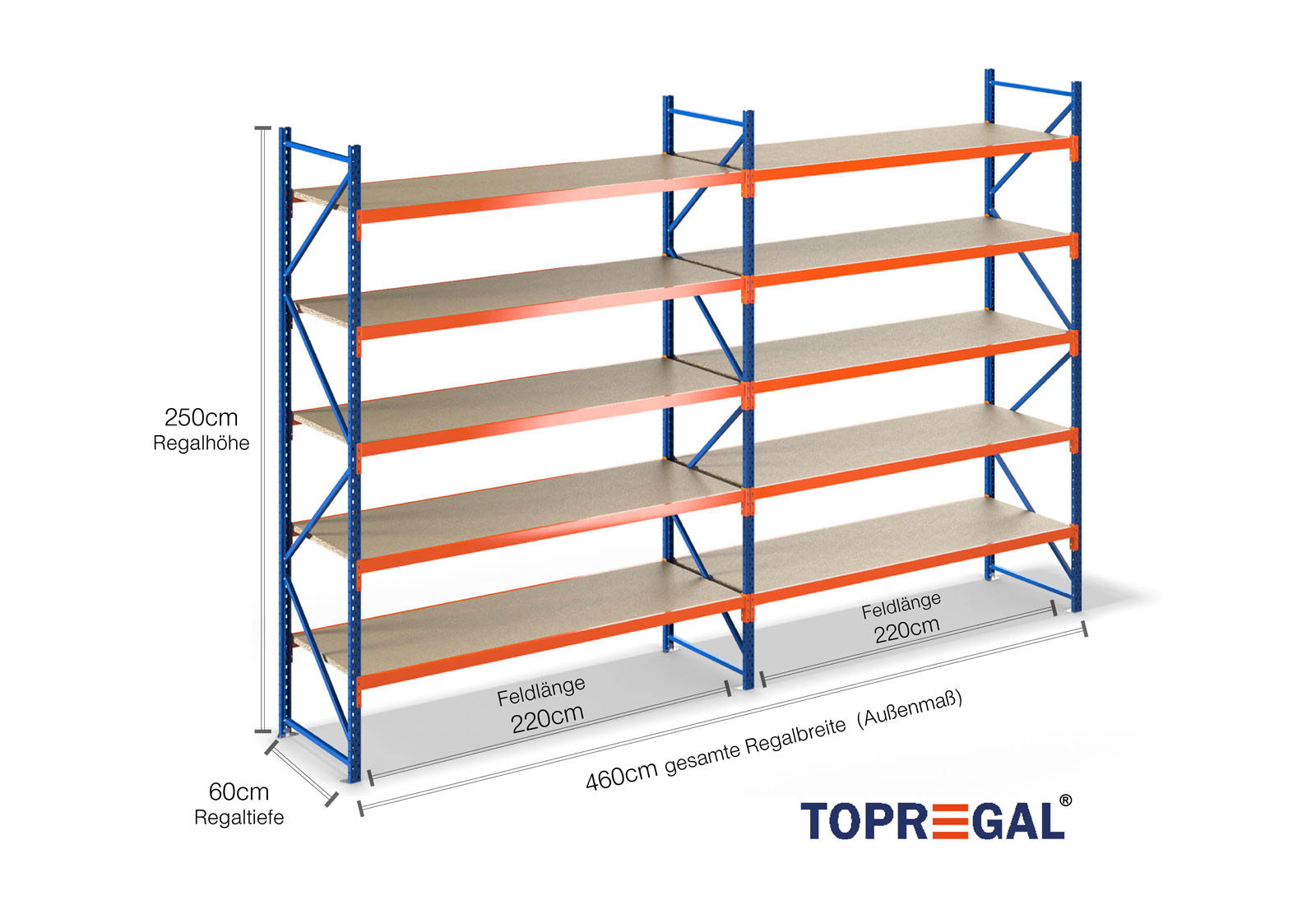 4,6 m magazijnstelling LR2000 / 60 cm diep / 2,5 m hoog / 5 niveaus / bodem hout