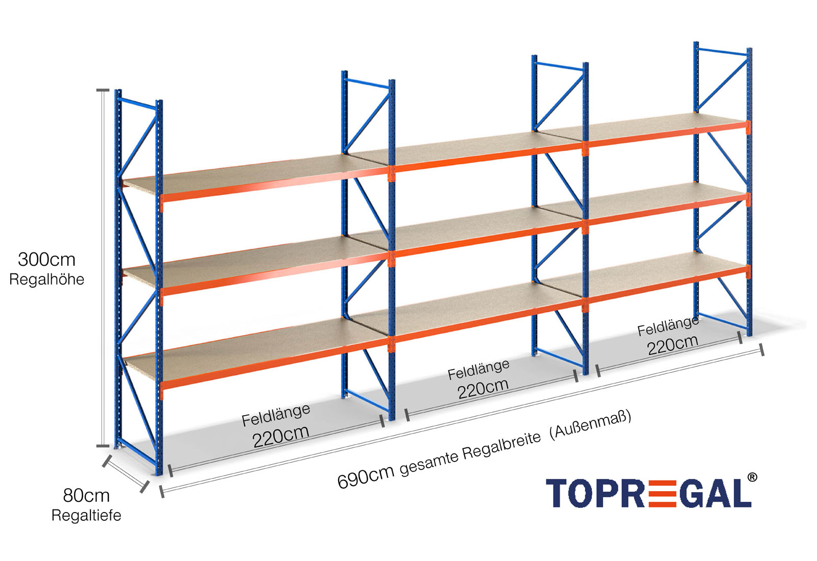 Deze magazijnstelling overtuigt met een hoogte van 3 m, is 80 cm diep en heeft een breedte van 6,9 m. De 3 niveaus bieden een maximale belasting van 500 kg per niveau, waarbij de maximale belasting tussen twee staanders (de schaplast) van 2.000 kg niet mag worden overschreden. Deze specificaties hebben altijd betrekking op een gelijkmatige belasting van de stellingen. De opbouw is dankzij het inhaaksysteem probleemloos en snel mogelijk. Voor de stellingen met brede overspanning van TOPREGAL is er bovendien een omvangrijke keuze aan onderdelen en accessoires, zoals stellingstaanders, traversen, magneetbanden en halfopen magazijnkratten.