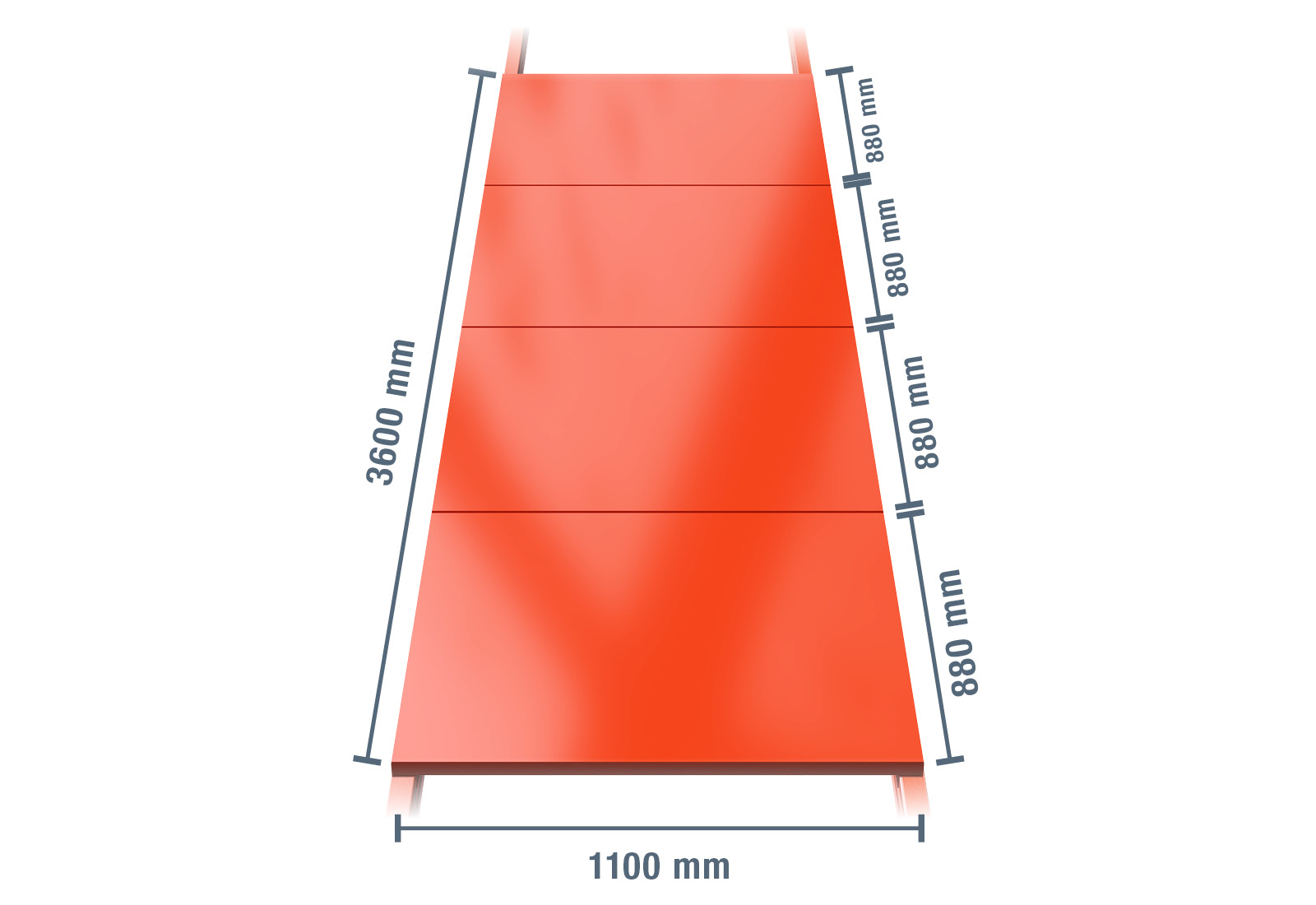 De stalen schap voor de palletstelling bestaat uit 4 modules, met een diepte van 1.100 mm en een breedte van 3.600 mm. De totale breedte is 885 mm. Elke module is bestand tegen een maximale belasting van 1.000 kg.