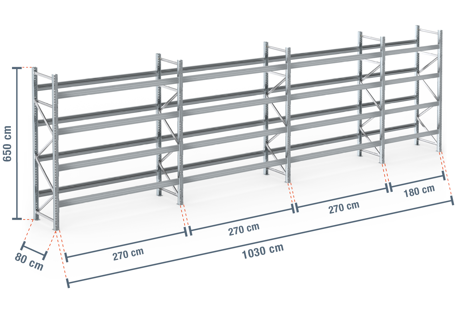 10,3 m palletstelling PR9000F thermisch verzinkt / 80 cm diep / 6,5 m hoog / 4 niveaus voor 55 europallets