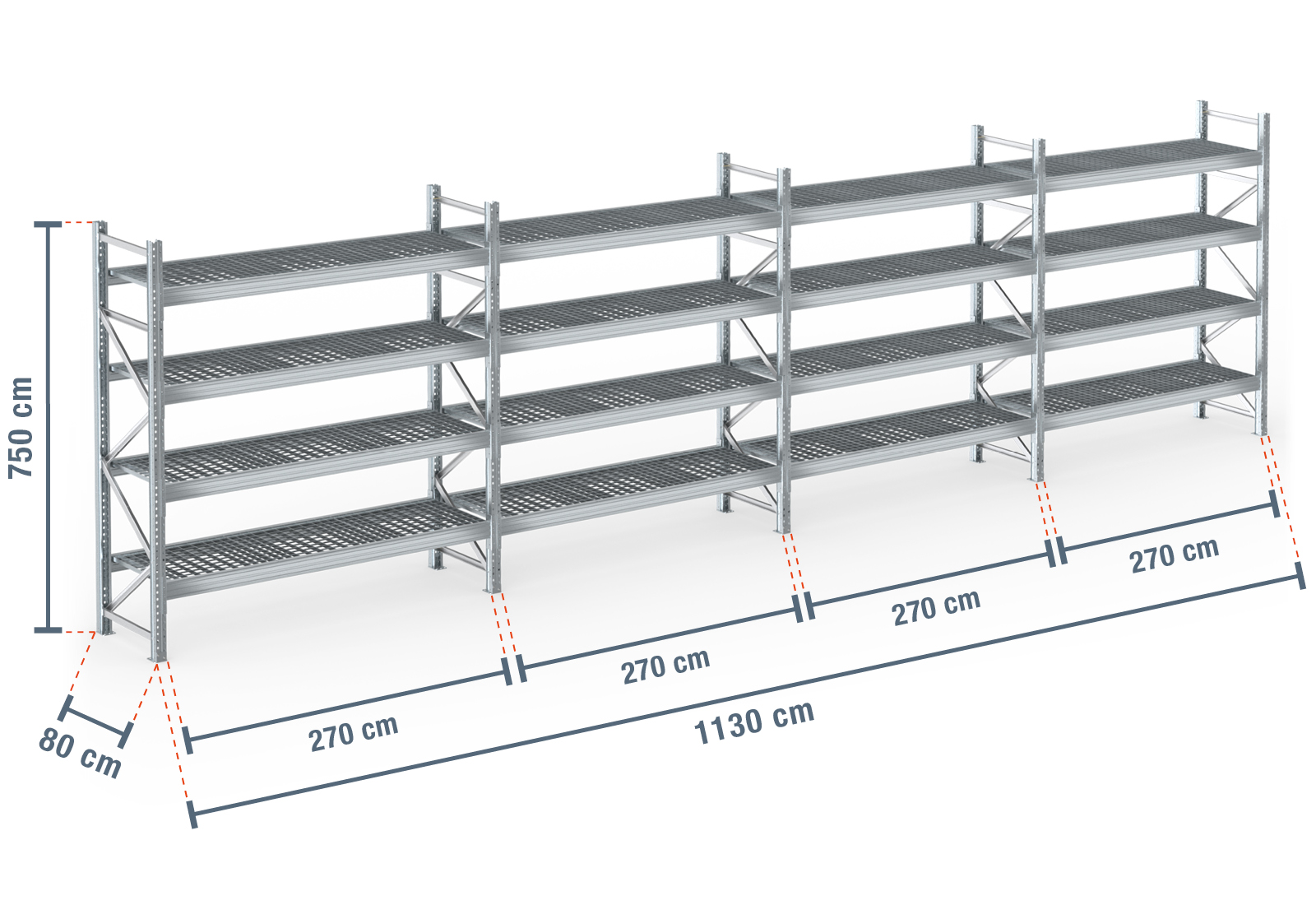 11,3 m palletstelling PR9000F thermisch verzinkt / 80 cm diep / 7,5 m hoog / 4 niveaus / bodem galvaniseerd rooster