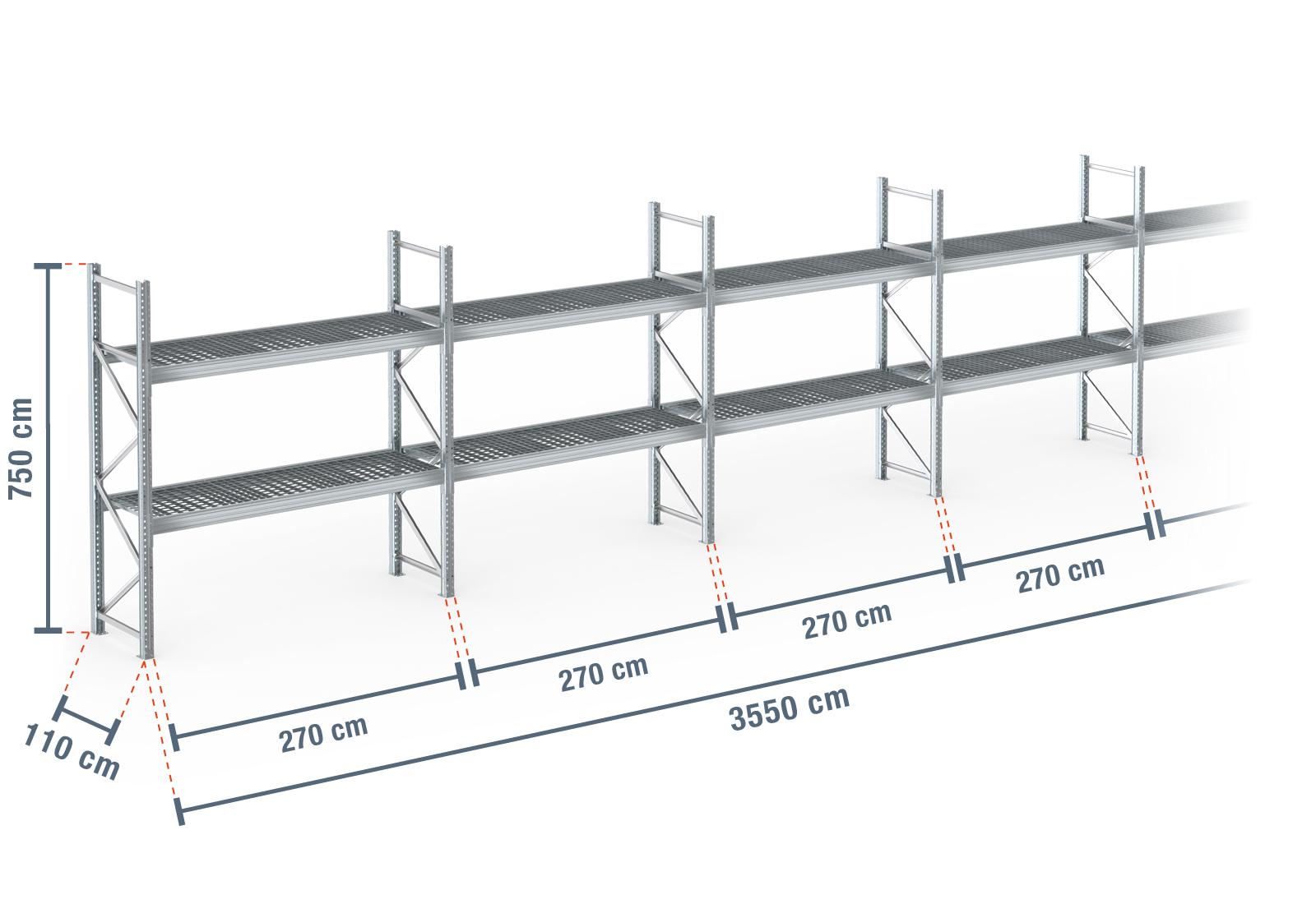 35,5 m palletstelling PR9000F thermisch verzinkt / 110 cm diep / 7,5 m hoog / 2 niveaus / bodem galvaniseerd rooster