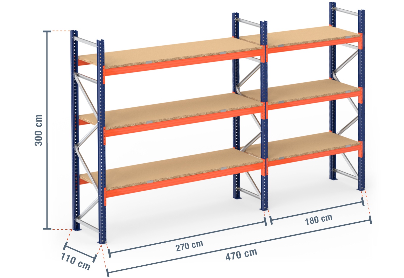 4,7 m palletstelling PR9000 / 110 cm diep / 3 m hoog / 3 niveaus / bodem hout