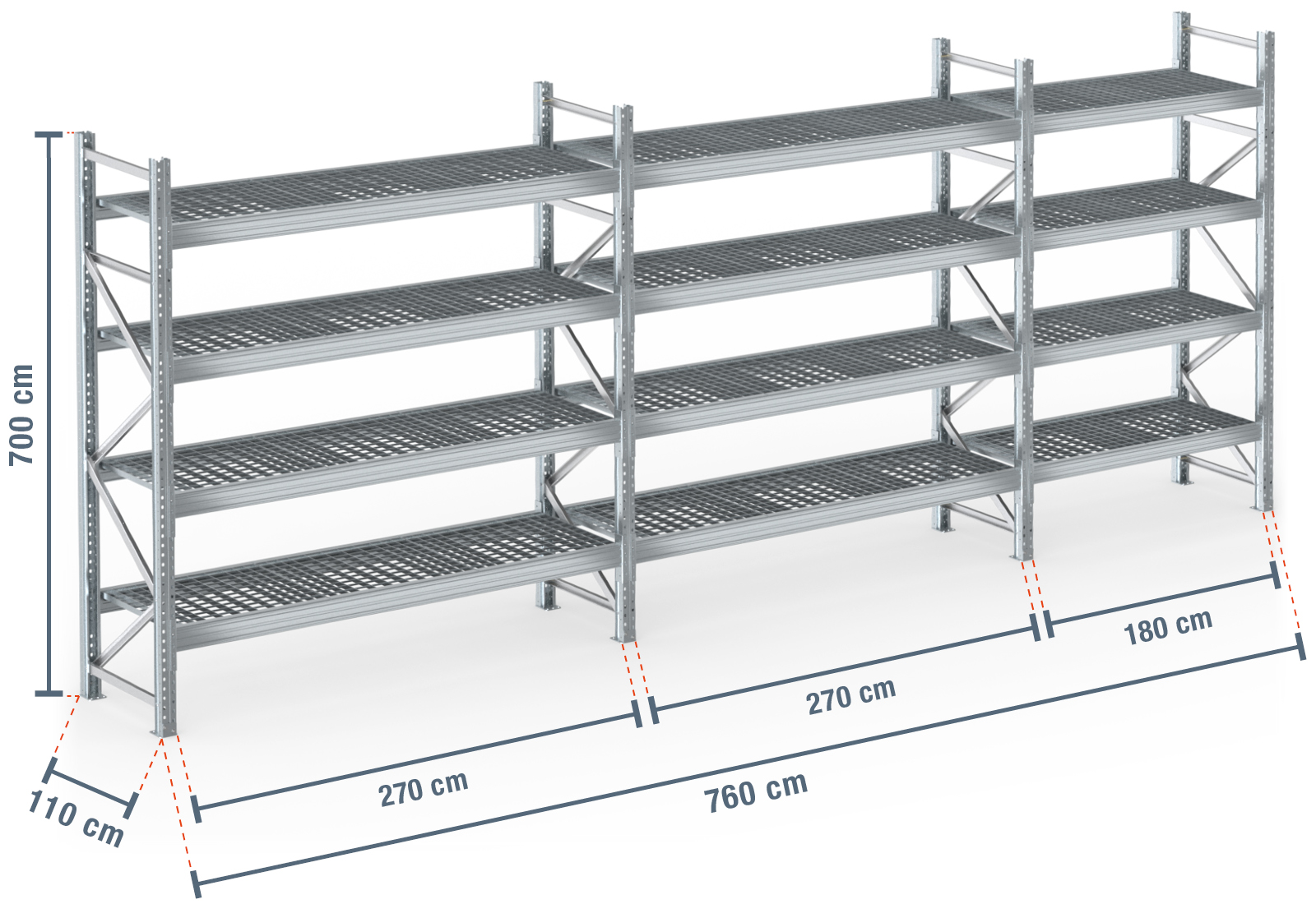 7,6 m palletstelling PR9000F thermisch verzinkt / 110 cm diep / 7 m hoog / 4 niveaus / bodem galvaniseerd rooster