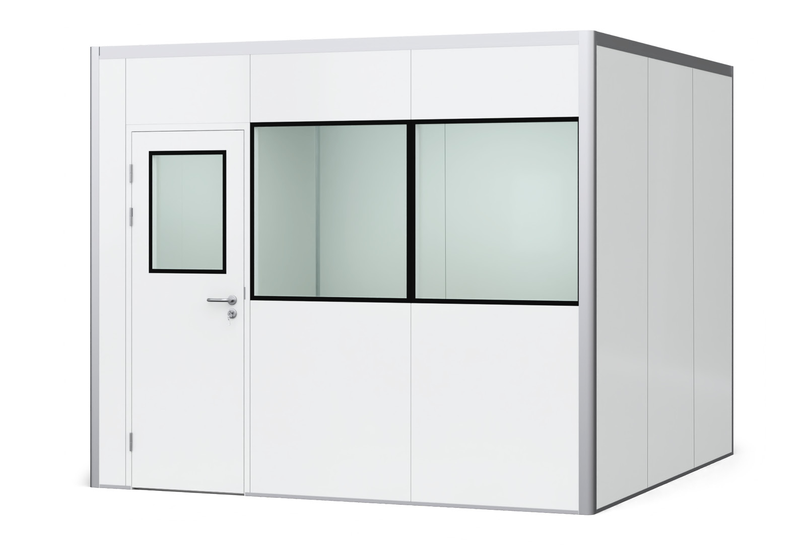 De hoogte (2.500 mm binnenmaat | 2.550 mm buitenmaat) en de diepte van de kamer (3.000 mm binnenmaat | 3.100 mm buitenmaat) blijven altijd gelijk. Het materiaal van de panelen, opgebouwd in sandwichconstructie, bestaat uit staal aan de buiten- en binnenkant (wit, gespoten, 0,4 mm staal) en steenwol in het midden als isolatielaag. Dit betekent dat de panelen niet bepaald licht zijn (11 kg/m²) maar wel zeer stabiel en dat er weinig geluid van de vaak lawaaierige halomgeving doordringt in het kamer-in-kamer-systeem. De isolatiewaarde ligt tussen 20 - 40 dB, afhankelijk van het geluidsniveau buiten. De warmte-isolatiewaarde van PREFAB halkantoren is 0,787 W/(m²K) en de warmtegeleiding is 0,05 W/(mK).INFO: Het dak kan niet betreden of belast worden.