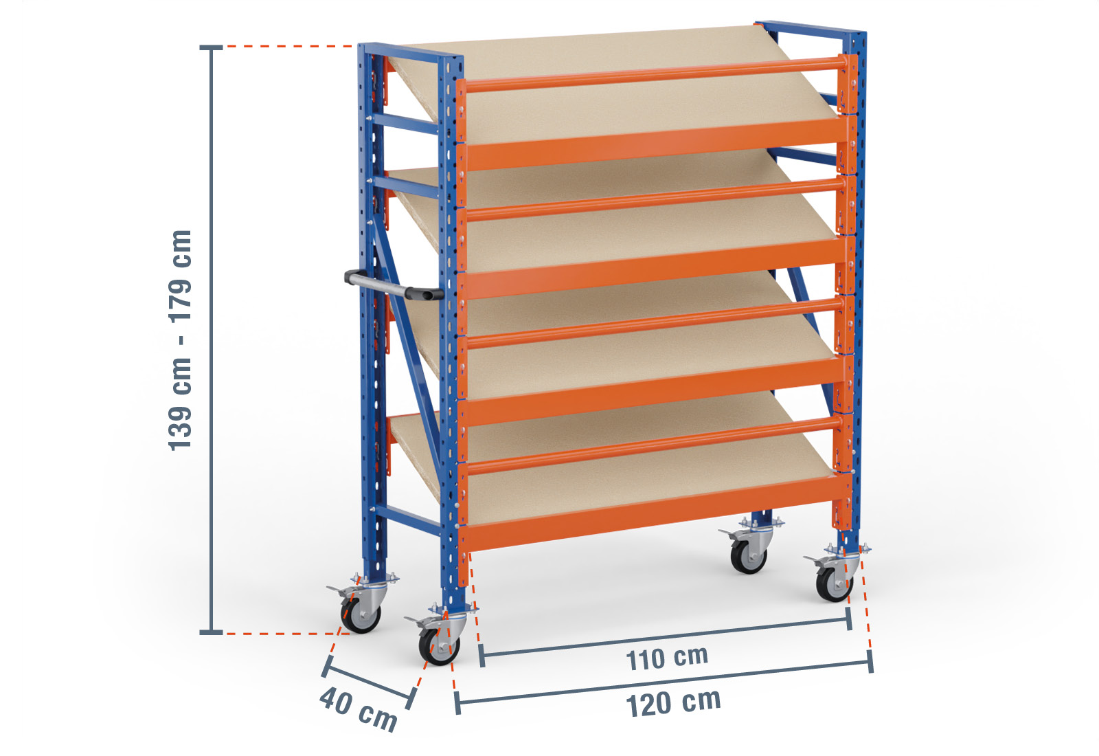 Deze verrijdbare stelling met schuine bodemen van TOPREGAL bestaat uit 4 niveaus, die elk zijn voorzien van een schuin geplaatste, houten stellingbodem. Eén niveau beschikt bovendien over twee traversen met meerdere niveaus, die de eigenlijke last dragen en een buistraverse die als valbeveiliging wordt gebruikt. De traversen zijn gelakt in de kleur oranje en kunnen individueel in een rooster van 50 mm ingehangen worden Zo verbetert u de ergonomie van uw stelling en kunt u uw vakken met de optimale grootte configureren.