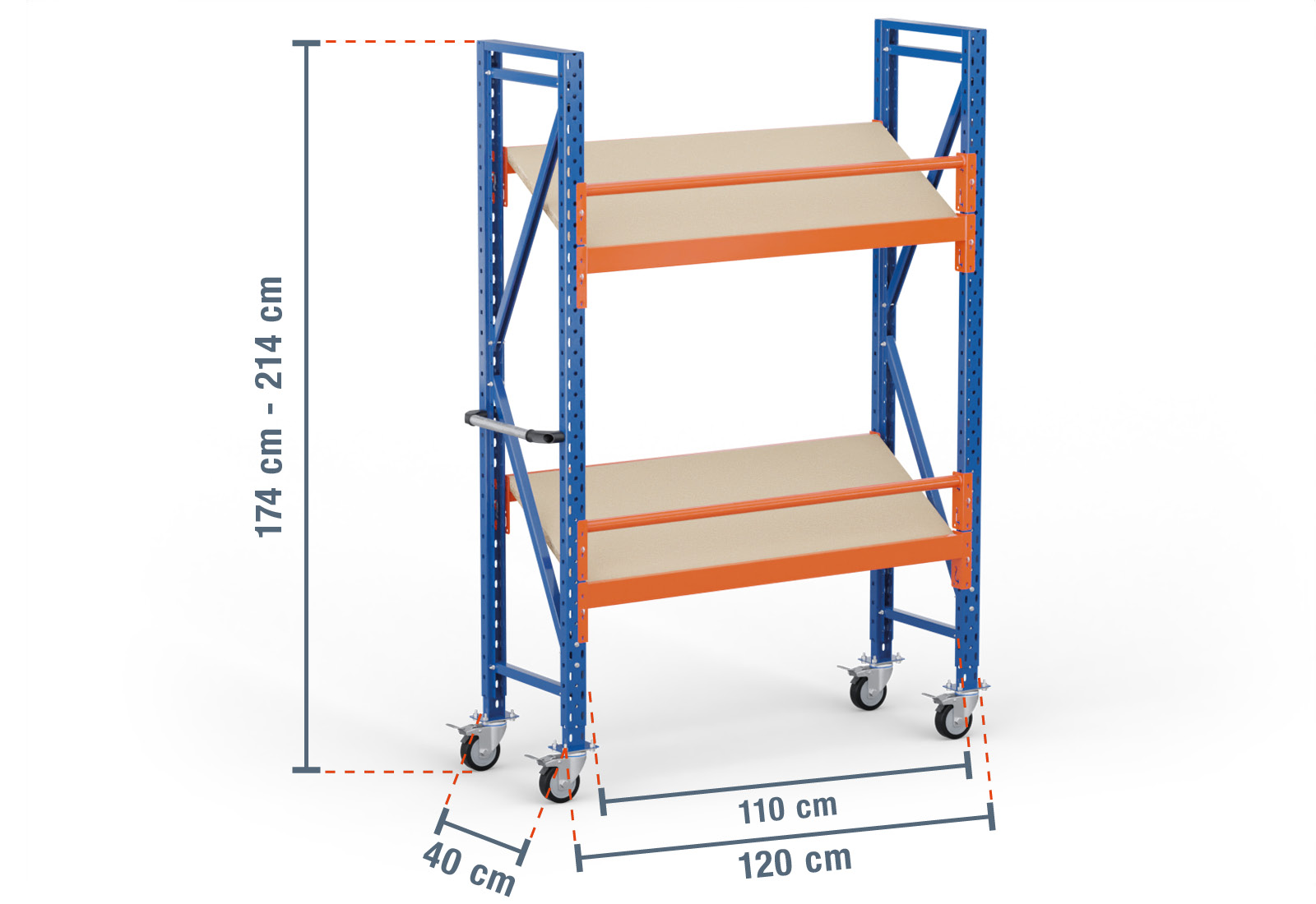 De buitenmaat van deze verrijdbare stelling met schuine bodemen is 1,2 m, waarbij het bruikbare oppervlak, de zogenaamde binnenmaat, 10 cm korter is. De maximale belastbaarheid van een stellingvak 300 kg en de schaplast (maximale belasting tussen twee stellingstaanders bij een gelijkmatige gewichtsverdeling) is 500 kg.