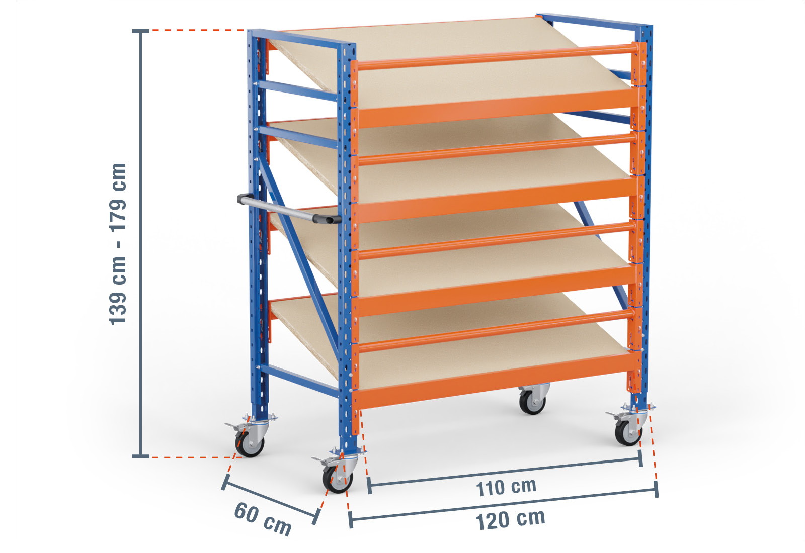 Deze verrijdbare stelling met schuine bodemen van TOPREGAL bestaat uit 4 niveaus, die elk zijn voorzien van een schuin geplaatste, houten stellingbodem. Eén niveau beschikt bovendien over twee traversen met meerdere niveaus, die de eigenlijke last dragen en een buistraverse die als valbeveiliging wordt gebruikt. De traversen zijn gelakt in de kleur oranje en kunnen individueel in een rooster van 50 mm ingehangen worden Zo verbetert u de ergonomie van uw stelling en kunt u uw vakken met de optimale grootte configureren.