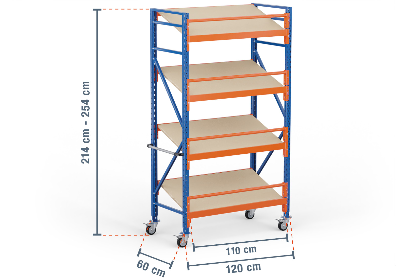 Deze verrijdbare stelling met schuine bodemen van TOPREGAL bestaat uit 4 niveaus, die elk zijn voorzien van een schuin geplaatste, houten stellingbodem. Eén niveau beschikt bovendien over twee traversen met meerdere niveaus, die de eigenlijke last dragen en een buistraverse die als valbeveiliging wordt gebruikt. De traversen zijn gelakt in de kleur oranje en kunnen individueel in een rooster van 50 mm ingehangen worden Zo verbetert u de ergonomie van uw stelling en kunt u uw vakken met de optimale grootte configureren.