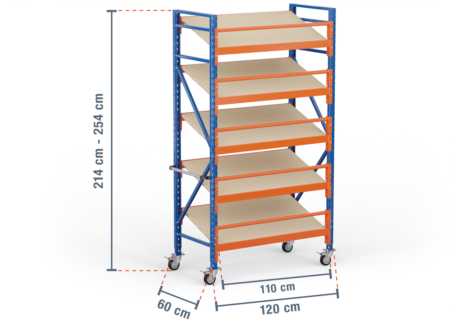 De afgeschuinde bodem zorgt voor optimaal wegnemen van pakketten en kleine onderdelen uit halfopen magazijnkratten alsmede uit bewaardozen. De schuine bodems hebben hierbij een hoek van 20 graden om zowel de zichtbaarheid als het weghalen aanzienlijk te vereenvoudigen. Dat bespaart tijd tijdens het orderpicken en verhoogt uw doorvoer bij de ingang en uitgang van goederen. De stelling kan eenvoudig worden vervoerd, waardoor diverse mogelijkheden in logistiek opzicht ontstaan: Zo is uw verpakkings-, montage- of goederenontvangstpunt niet afhankelijk van de daadwerkelijke locatie en kan indien gewenst flexibel worden gewijzigd. Kleine onderdelen zoals schroeven of moeren kunnen nu net zo eenvoudig van A naar B worden verplaatst als goederen die moeten worden gepickt.
