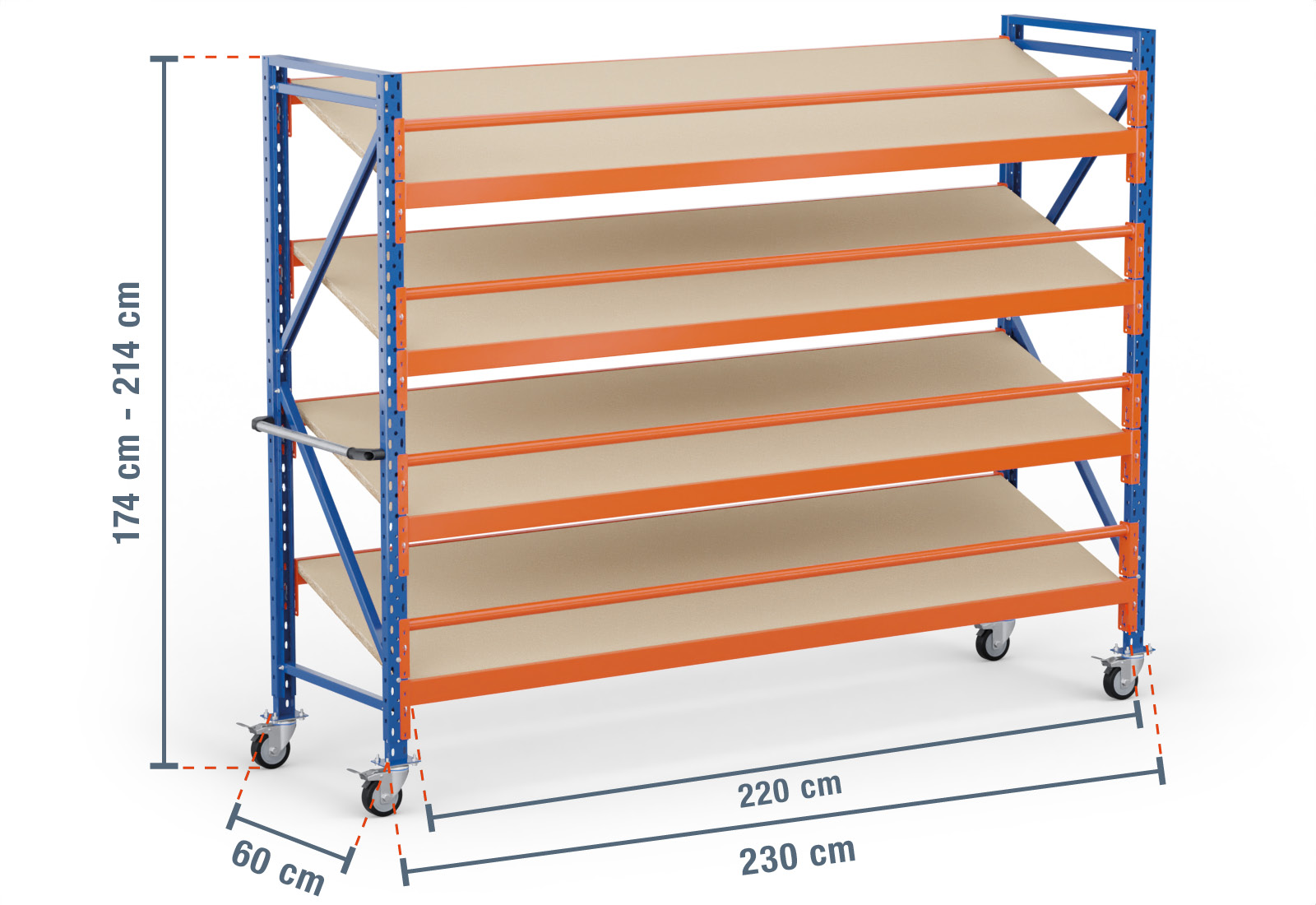 2,3 m werktafel stelling met schuine bodemen verrijdbaar SR1500 / 60 cm diep / 1.740 - 2.140 mm hoog / 4 niveaus / bodem hout